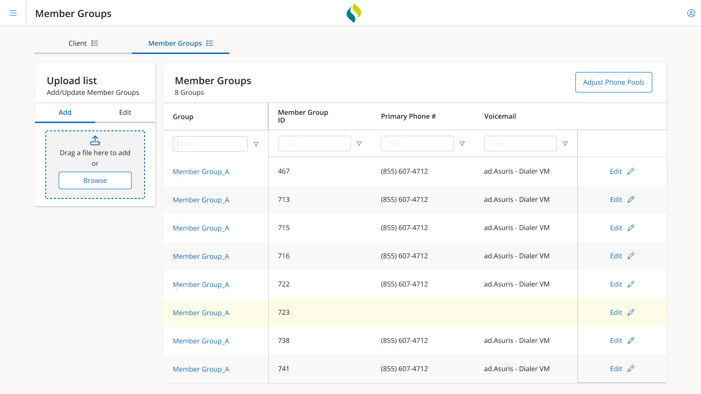 To mitigate being blocked and marked as spam, we wanted to implement an automatic round robin approach where fresh numbers will cycle and at-risk phone numbers have time to cool off. We also needed a new interface to add new numbers, map phone numbers to client membership, and add and adjust any associated voicemails.